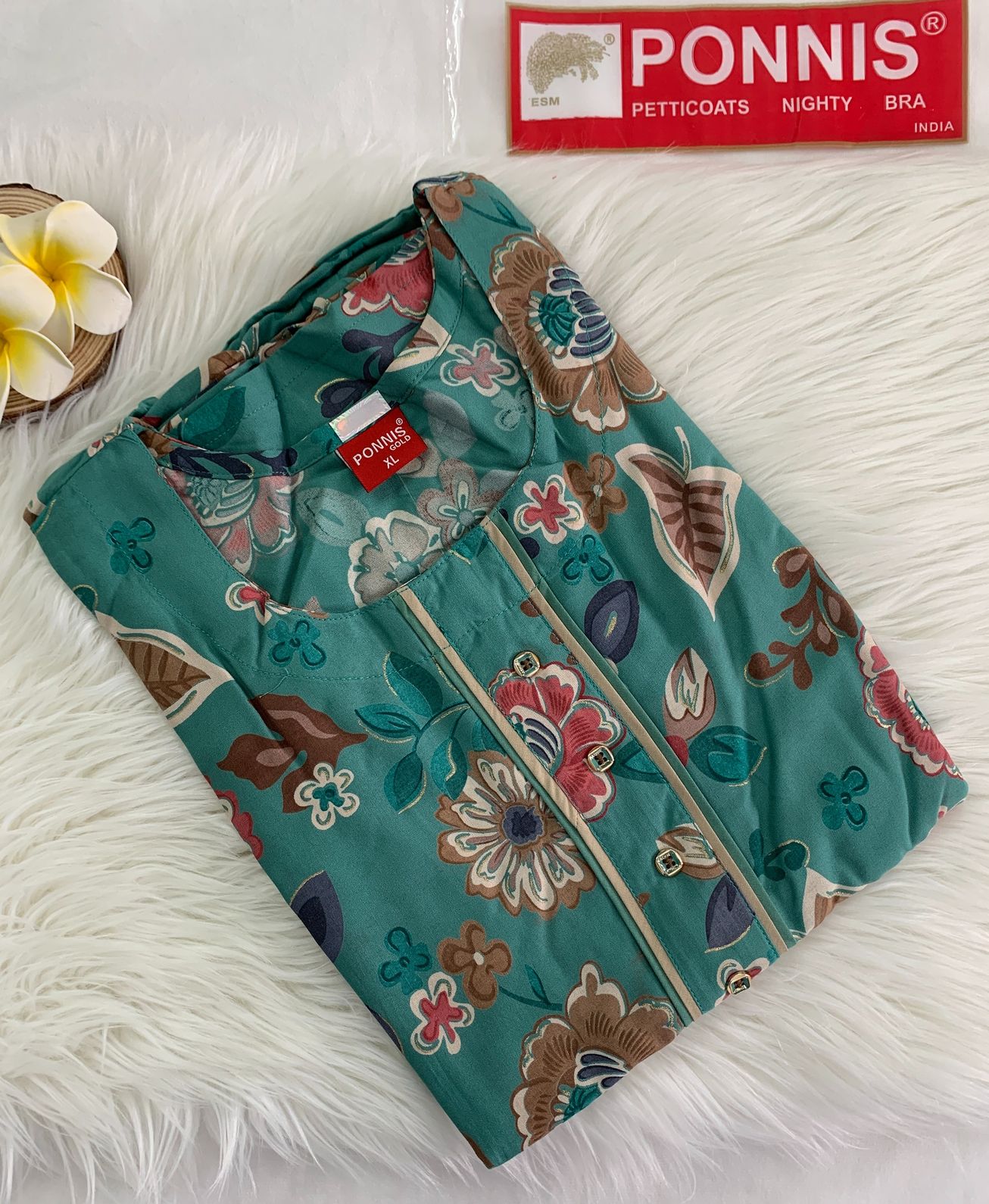 Step into comfort and elegance with this PONNIS Gold long maxi nighty, crafted from soft , breathable Rayon fabric.The vibrant floral prints, adding a touch of charm to your nightwear.