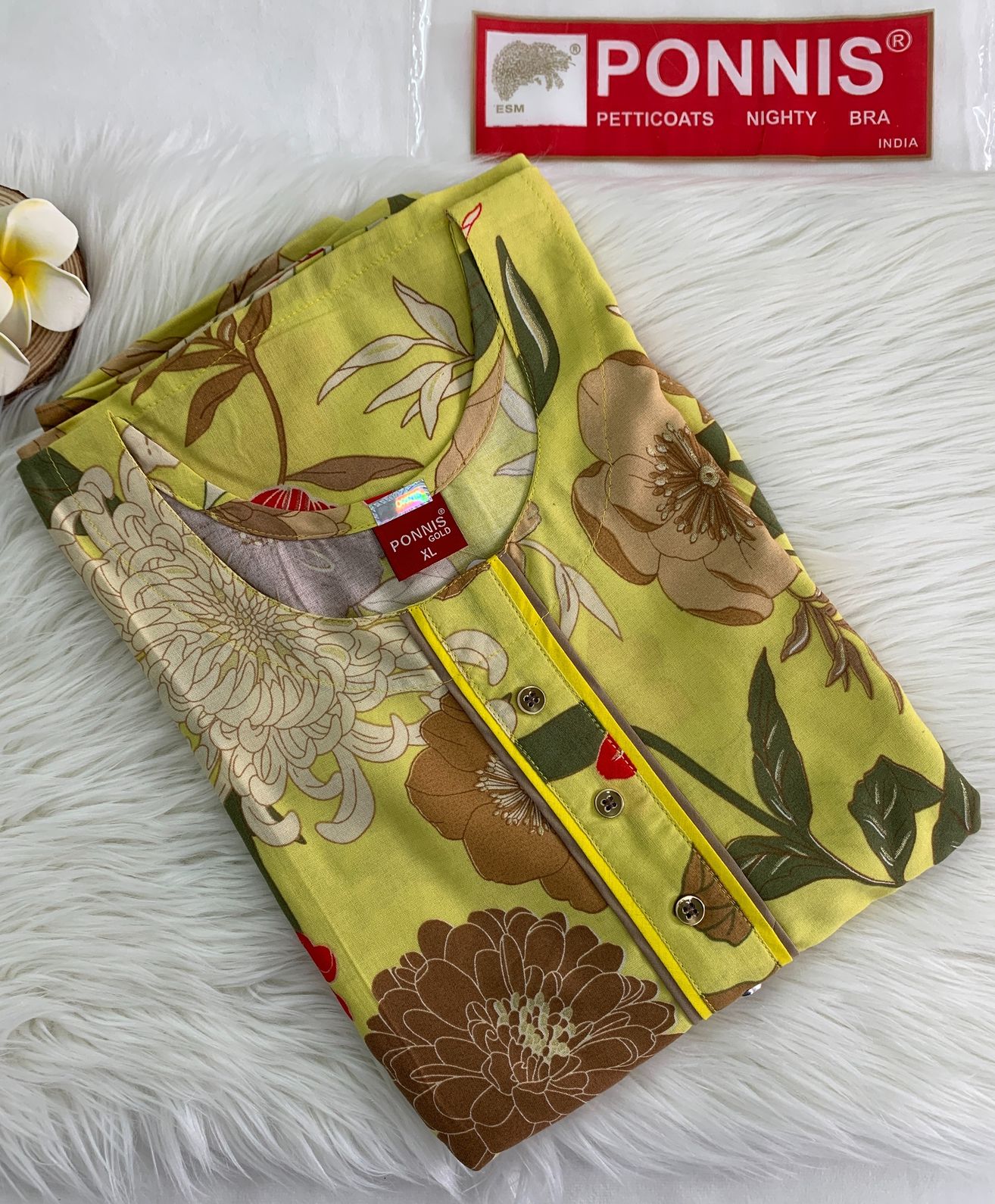 Step into comfort and elegance with this PONNIS Gold long maxi nighty, crafted from soft , breathable Rayon fabric.The vibrant floral prints, adding a touch of charm to your nightwear.