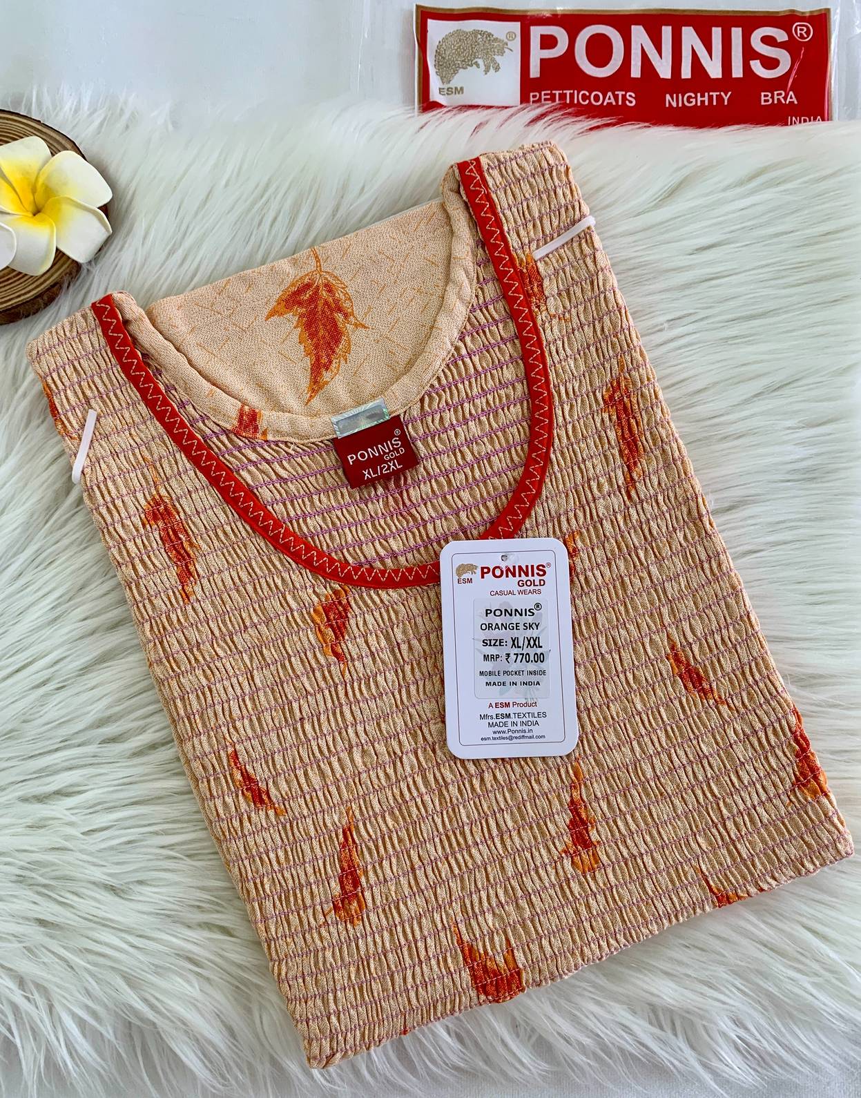 PONNIS Premium Women’s Alphine Cloth A-line and Smocking Detailing Nighty (Orange Sky)