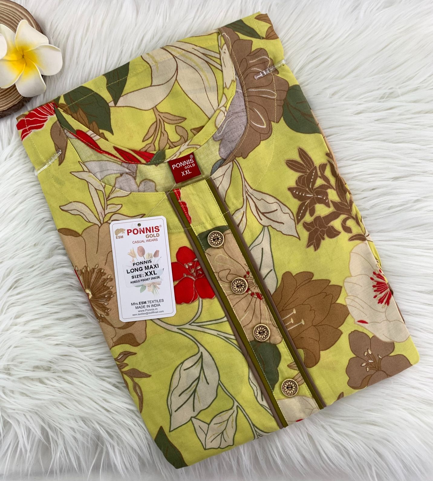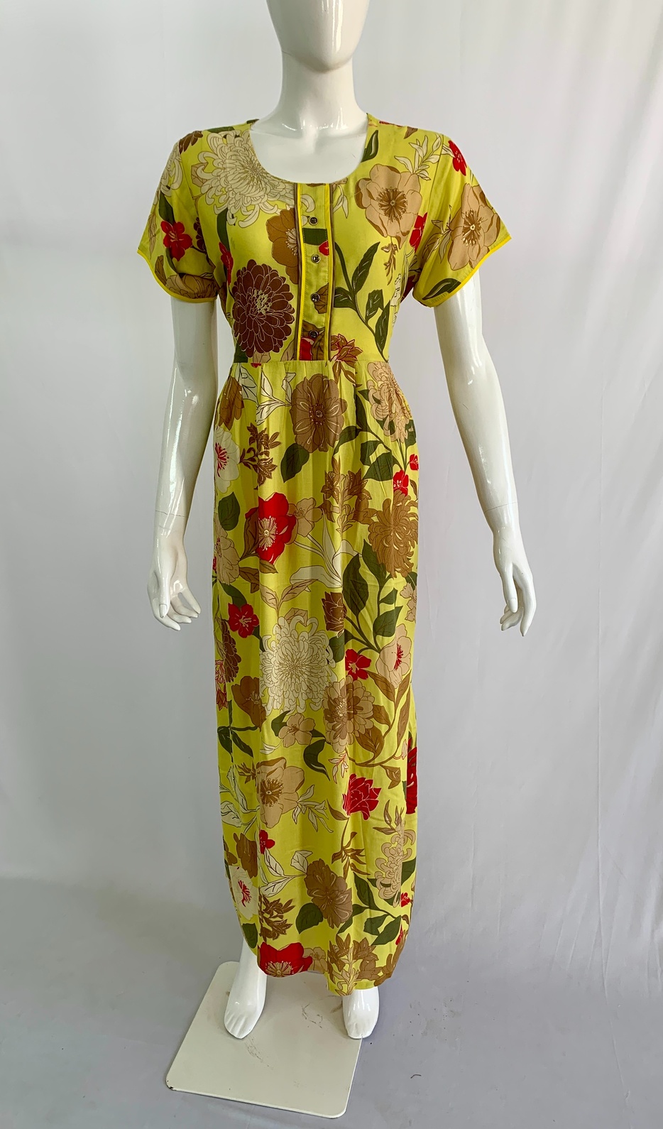 Step into comfort and elegance with this PONNIS Gold long maxi nighty, crafted from soft , breathable Rayon fabric.The vibrant floral prints, adding a touch of charm to your nightwear.